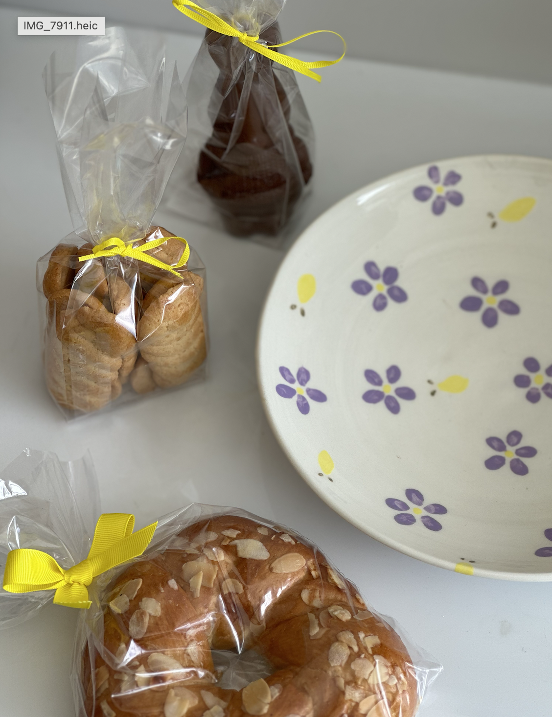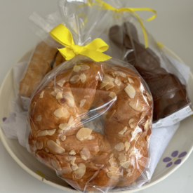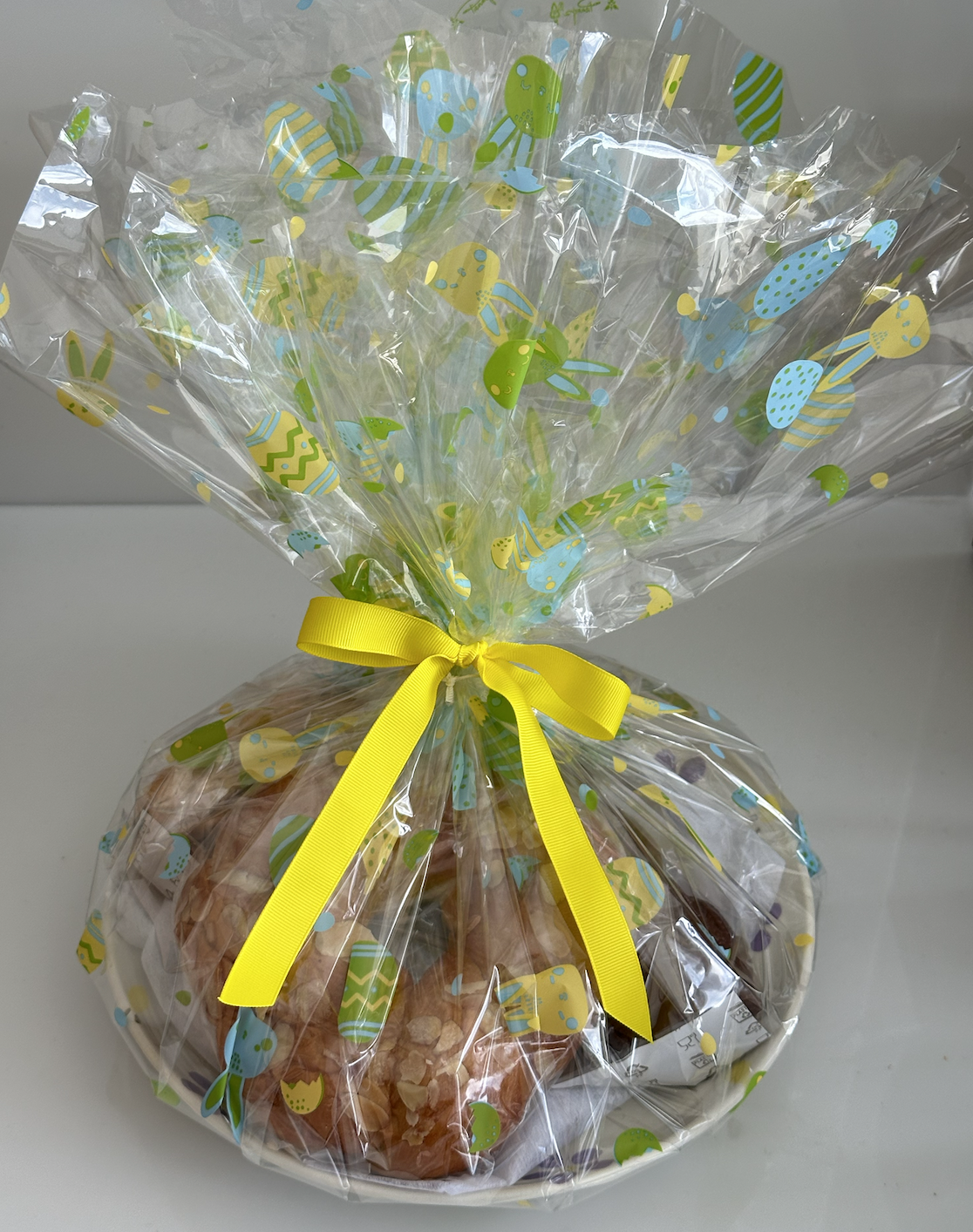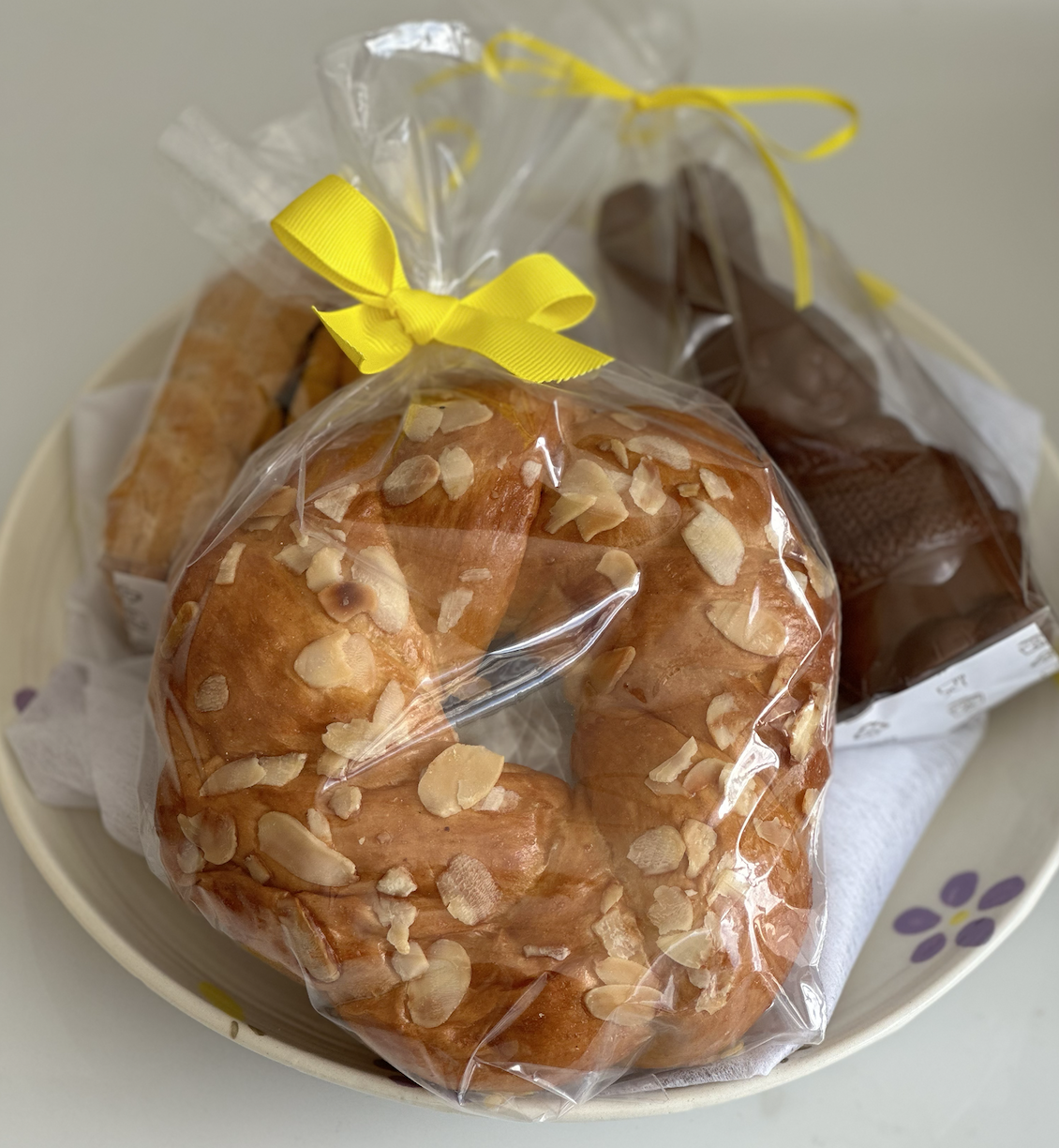 Χειροποίητη κεραμική πιατέλα, mini λαμπροκουλούρα (100g περίπου), σοκολατένιο λαγουδάκι με αληθινή σοκολάτα γάλακτος που υποστηρίζει το κίνημα Cacao Trace (100g περίπου) και πασχαλινά μπισκοτάκια βουτύρου “τσουρεκάκια” (170g περίπου).